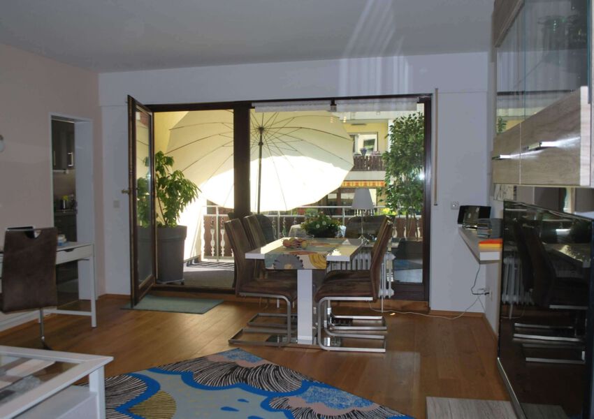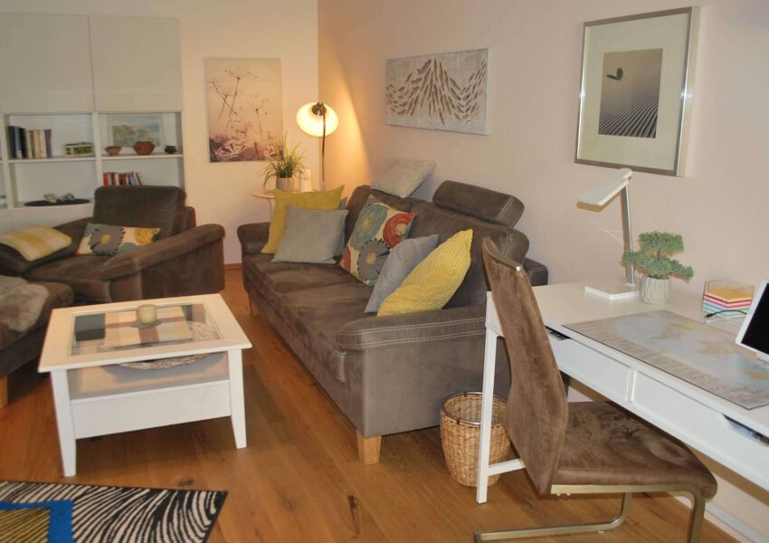 Im Wohnzimmer wartet eine moderne Couch und ein Sessel mit Fußhocker, ein Esstisch mit 4 Stühlen vor dem Balkonfenster, einen Schreibtisch, einen Flachbild-TV und eine Stereoanlage auf Sie.
